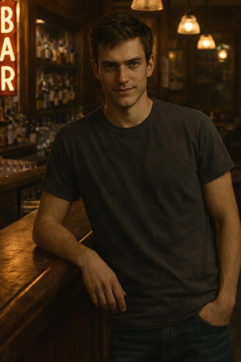 "Kyle is my vision of one of those earnest, open-faced younger guys you spot in groups or leaning at a bar, sharing a laugh or a quiet moment. He started as a simple idea pulled from real life and part of the everyday crowd, but with traits that grow and shift in unexpected ways through the stories. Here's how he appeared to me, casual, approachable, but with eyes that hint at more. But as always, when you meet him in The Twisted Branch, he'll look and feel exactly right to you. What's your Kyle like?"